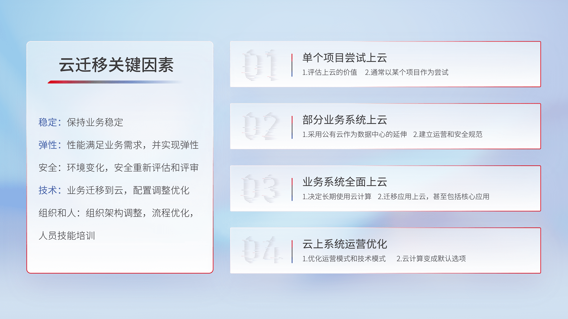 结合实际业务,,,,从规划设计、、、、云平台选型、、、、云原生改造、、数据迁移、、集成交付,,,迁移全过程为客户识别最佳上云路径,,,,做好风险识别管理,,设计网络架构、、身份权限、、、安全审计合规、、、操作审计、、日志审计、、、、监控告警策略、、、多站点容灾设计等,,对云上基础设施进行整体规划,,,提升IT治理水平,,,,以满足弹性、、高可用、、高性能的需求。。。